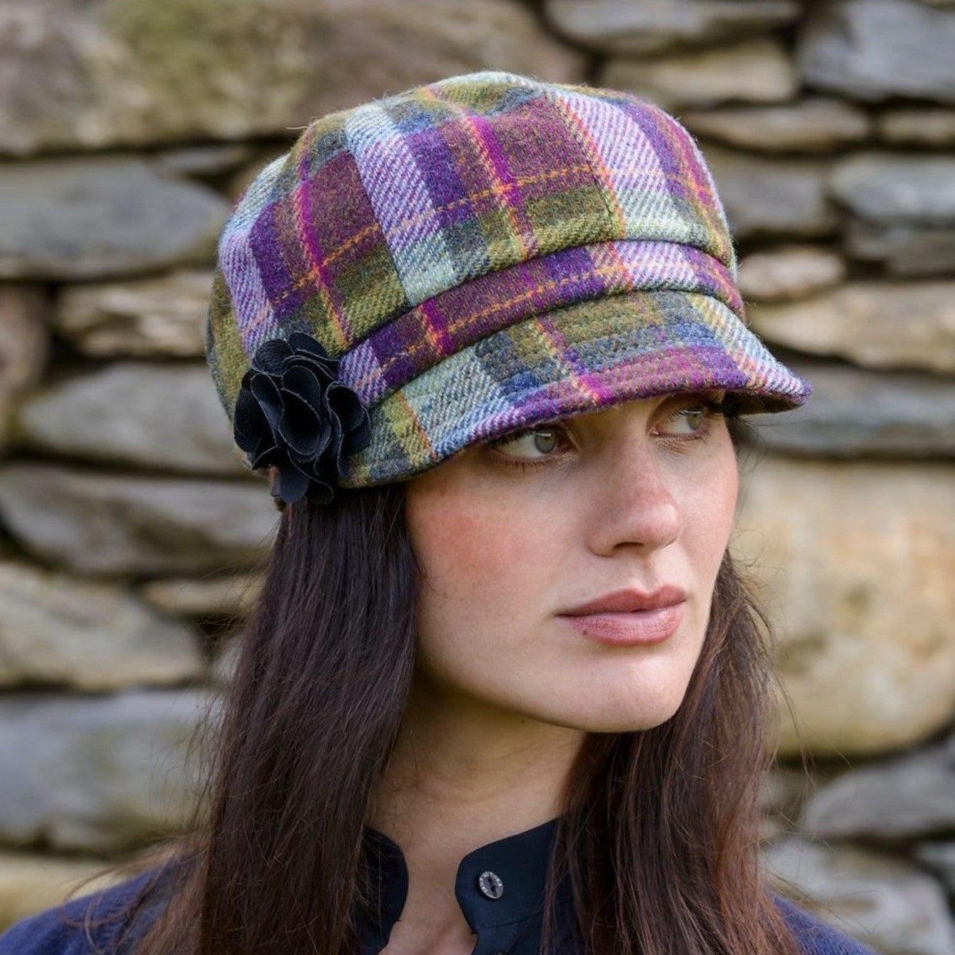 With a flower decoration on the side, this ladies' tweed newsboy cap has a retro feel with a modern twist.