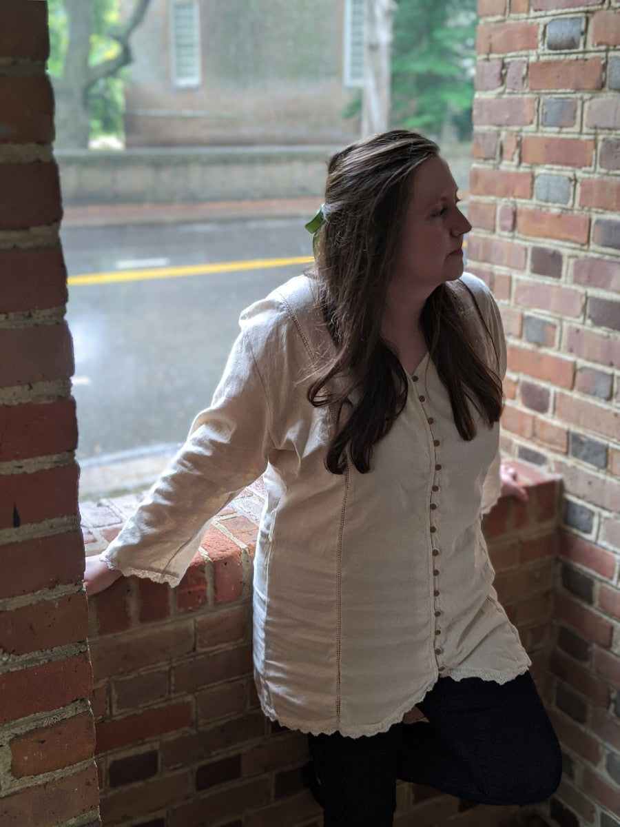 Made from a comfortable blend of cotton and linen, our women's Sunday shirt is a more tapered version of our best-selling grandfather shirt for men. Lace trim decorates the edges, and a stylish 15-button closure is an eye-catching design feature that will make this a treasured piece of your wardrobe.